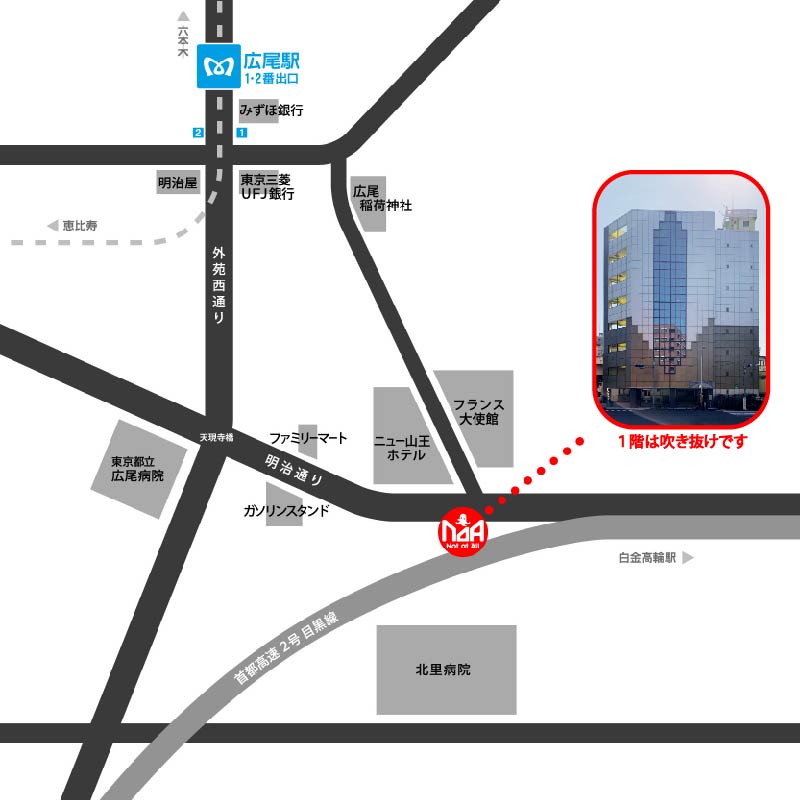 広尾駅から :東京メトロ 日比谷線 広尾駅 天現寺橋方面(出口1,2番)下車 徒歩8分